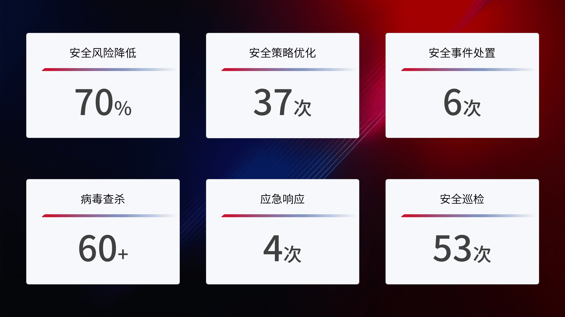 提供全面的安全事件报告体系,,包括处置报告、、、、周报、、、、季度和年度总结,,,结合持续监控,,帮助客户深入了解网络安全状况。。。。