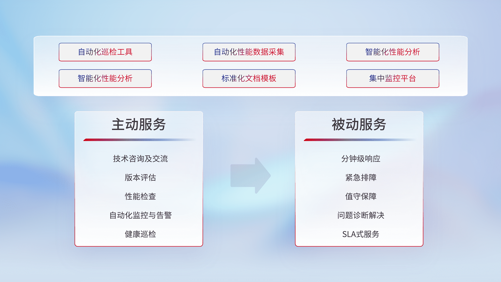 智能化工具和标准化文档,,保障服务质量,,提供主动服务(包含技术咨询、、、版本评估、、、性能检查、、、自动化监控与告警、、、、健康巡检)和被动服务包含(分钟级响应、、紧急排障、、、值守保障、、问题诊断解决、、、SLA服务)。。。。